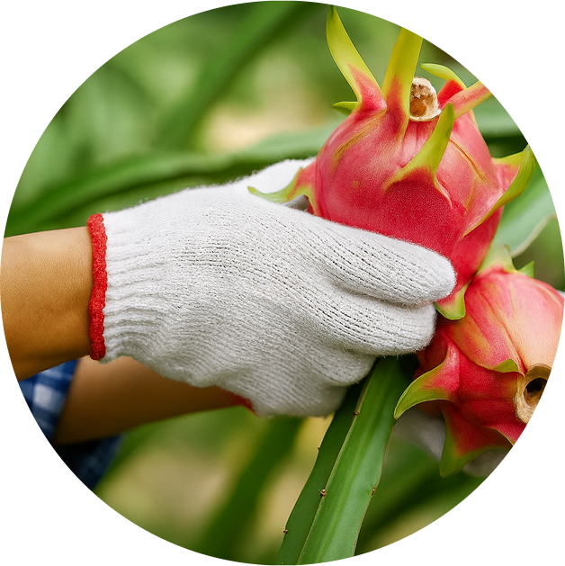 Cosechamos nuestras pitahayas con las mejores prácticas agrícolas, usando siempre equipo desinfectado antes y durante todo el proceso para cortar el fruto de forma cuidadosamente manual evitando daños en las brácteas y espinas de la planta, lo que preserva la calidad y apariencia del producto.